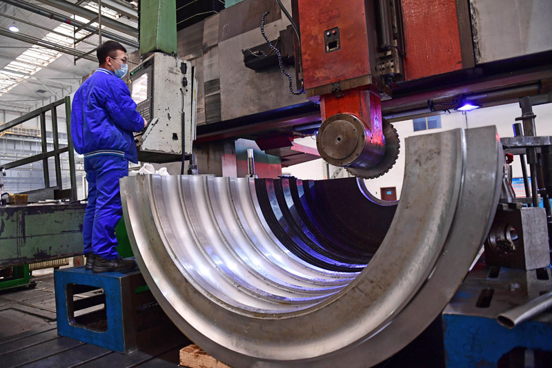 在沈阳鼓风机集团车间,工人通过屏幕操作机器加工产品内机壳(2020年3月16日摄)。新华社记者 杨青 摄