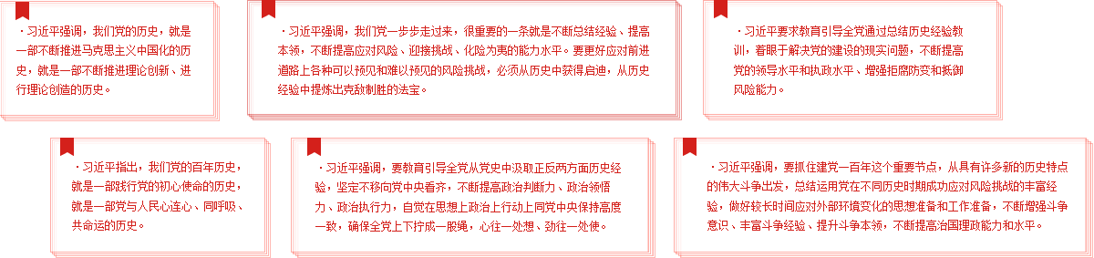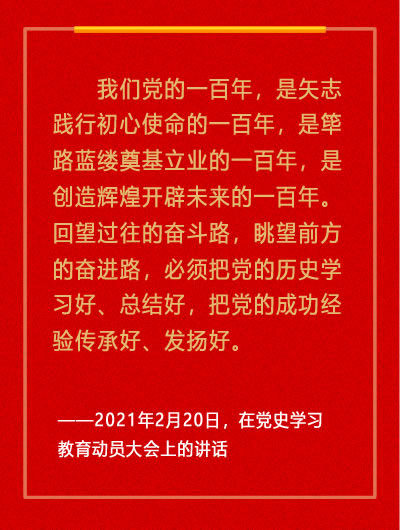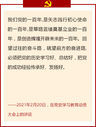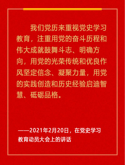 习近平强调,我们党历来重视党史学习教育,注重用党的奋斗历程和伟大成就鼓舞斗志、明确方向,用党的光荣传统和优良作风坚定信念、凝聚力量,用党的实践创造和历史经验启迪智慧、砥砺品格。党的十八大以来,党中央高度重视学习党的历史,提出了一系列要求。在庆祝我们党百年华诞的重大时刻,在“两个一百年”奋斗目标历史交汇的关键节点,在全党集中开展党史学习教育,正当其时,十分必要。【详细】