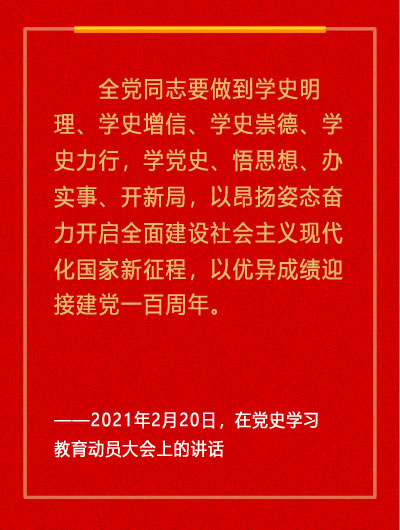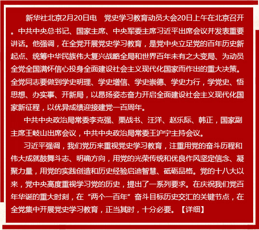 新华社北京2月20日电 党史学习教育动员大会20日上午在北京召开。中共中央总书记、国家主席、中央军委主席习近平出席会议并发表重要讲话。他强调,在全党开展党史学习教育,是党中央立足党的百年历史新起点、统筹中华民族伟大复兴战略全局和世界百年未有之大变局、为动员全党全国满怀信心投身全面建设社会主义现代化国家而作出的重大决策。全党同志要做到学史明理、学史增信、学史崇德、学史力行,学党史、悟思想、办实事、开新局,以昂扬姿态奋力开启全面建设社会主义现代化国家新征程,以优异成绩迎接建党一百周年。